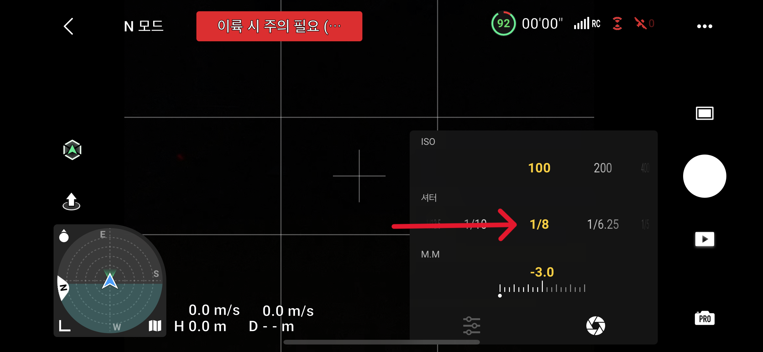 4. 드론을 띄우고 위치를 정한 다음, 화면에서 오른쪽 아래 카메라 아이콘을 눌러 프로 모드로 바꿉니다. 이때, 갑자기 화면이 어두워지거나 새카매질 수 있는데 ND 필터에 의한 정상적인 변화이니 안심하세요. 카메라 아이콘 안 글씨가 AUTO에서 PRO로 바뀌면 됩니다. 그 다음, 카메라 아이콘 왼쪽의 숫자 네 개(또는 두 개)가 모인 부분을 눌러 주세요. 지도 표시 설정에 따라 저와 모양이 조금 다를 수 있는데, 그냥 카메라 아이콘 바로 왼쪽의 숫자 부분을 누르면 됩니다.