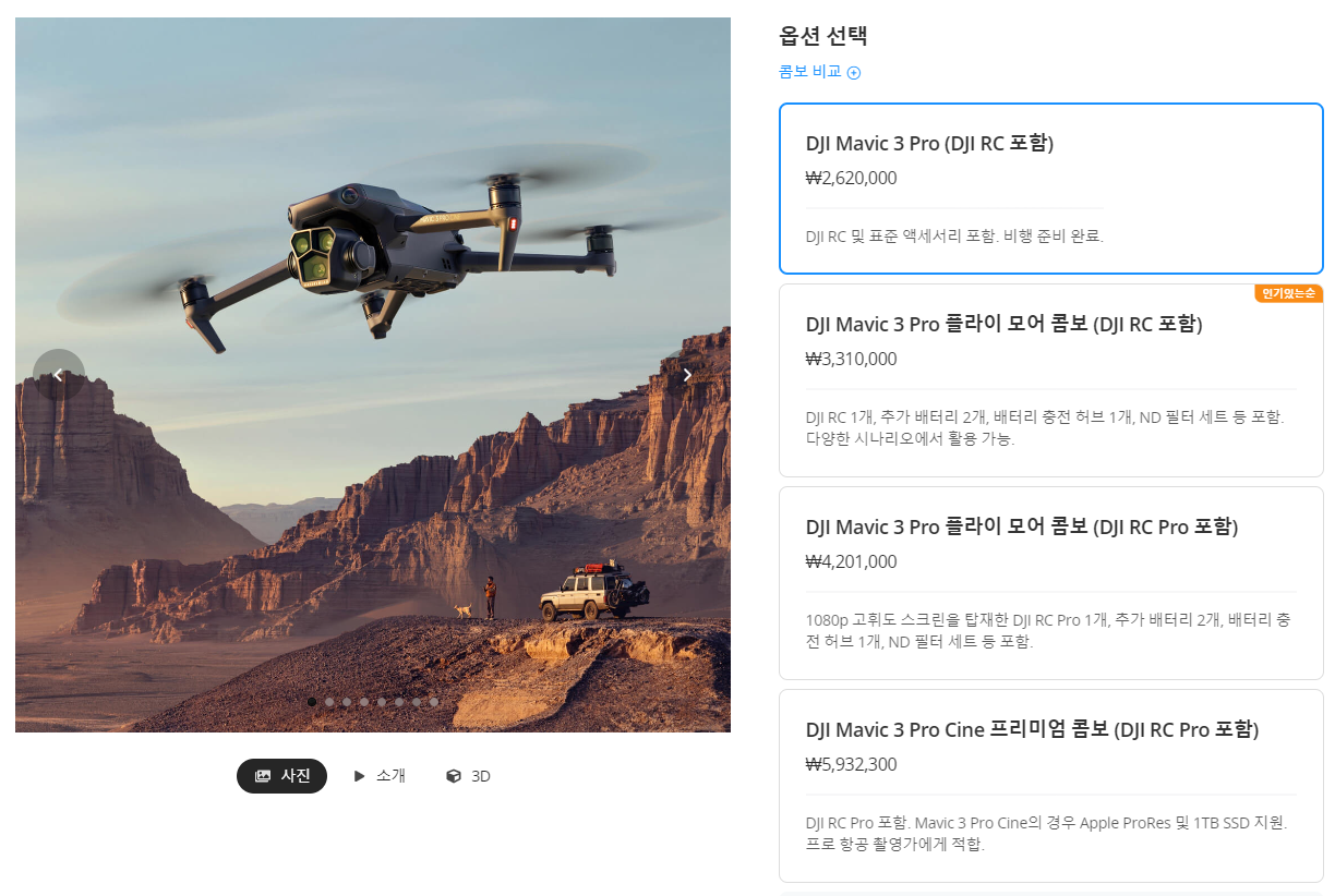 매빅 3 프로 플라이 모어 콤보 (DJI RC 포함)은 331만원($2999),
