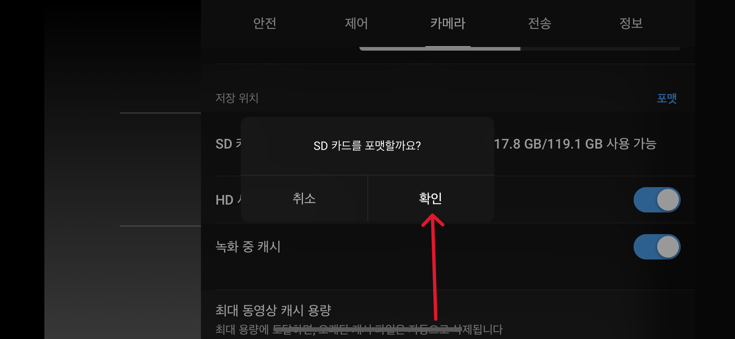 경고: 포멧을 시행하면 SD 카드 내부의 모든 정보가 삭제됩니다. 찍은 사진과 영상이 전부 잘 백업되었는지 확인한 후 포멧을 진행하시기 바랍니다.