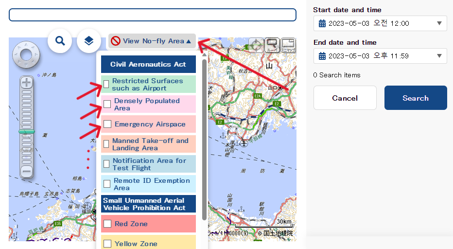 1. 일본 공역 지도를 통해 날릴 수 있는 곳을 확인하고, 여행 계획에 맞을지 확인한다.