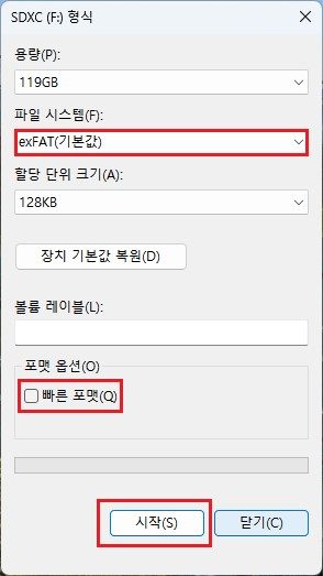 사진처럼 빠른 포맷을 체크 해제했다면, '시작'을 눌러 포맷하시면 됩니다.