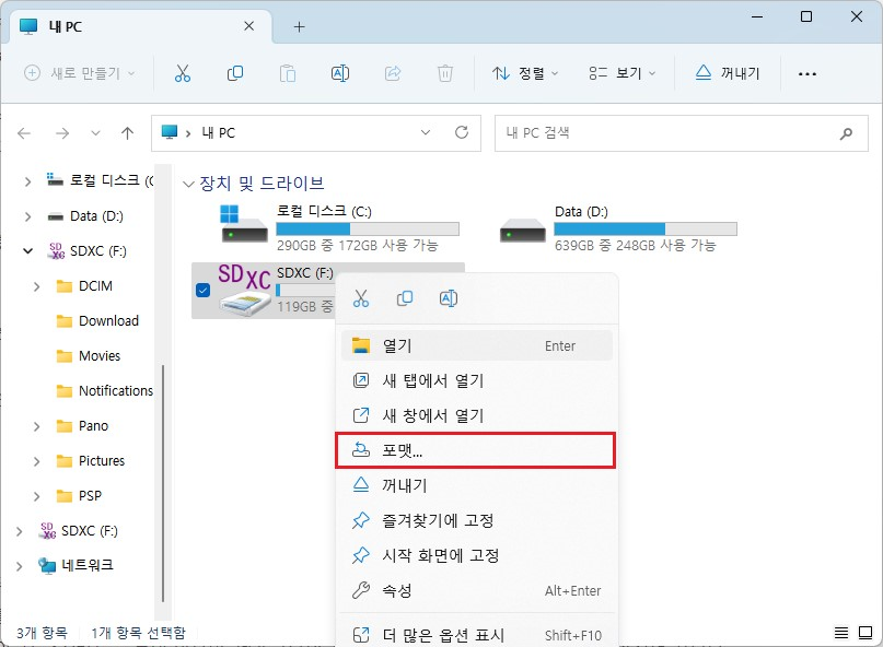 2. 탐색기에서 포맷 선택