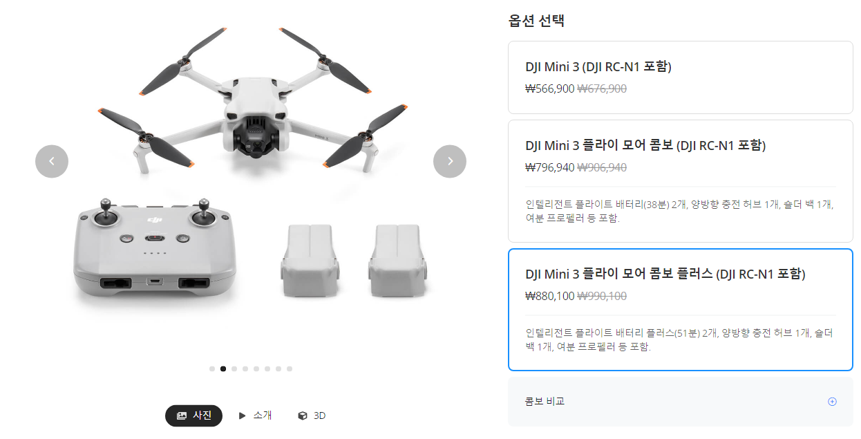 그런데 DJI 스토어를 잘 살펴보면, 미니 3 시리즈에는 플라이 모어 콤보 이외의 콤보가 하나 더 있습니다.