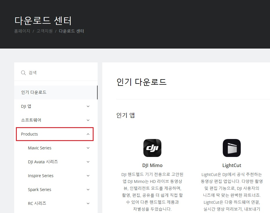 2. 왼쪽 창에서 'Products'를 눌러서 펼친 뒤, 자신의 드론 모델을 찾습니다.