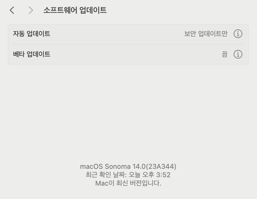 맥을 최신 macOS 버전인 macOS 14 Sonoma로 업데이트합니다. 설정 - 일반 - 소프트웨어 업데이트 로 들어가 최신 버전으로 업데이트해 줍니다. 업데이트 창에서 아래와 같이 Sonoma 최신 버전이라고 표시되면 됩니다.