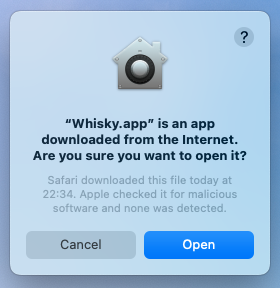 다운로드 받은 Whisky를 엽니다. 그러면 처음에는 아래와 같은 경고창이 뜨는데요. 오른쪽 '열기'를 누르시면 Whisky가 실행됩니다.