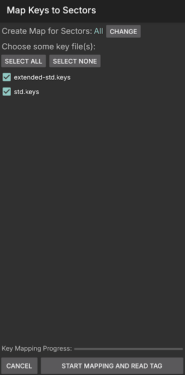 위 화면처럼 보이는 상태에서 폰 후면에 복사하려는 카드를 대어서 인식시킵니다. 인식되면 진동이 울리고, 화면 하단에 토스트 알림이 뜹니다. 카드를 계속 후면에 댄 상태에서 하단의 Start mapping and read tag 버튼을 눌러 NFC 카드의 정보를 불러옵니다.