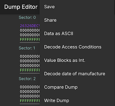 Dump Editor까지 잘 뜬다면 복사가 잘 되는 카드라는 뜻입니다. 맨 위에 Sector: 0에 있는 보라색 글자들이 카드의 고유 ID입니다. 이걸 복사하면 되는 거죠. 창에서 오른쪽 위의 점 세개 메뉴를 누르고 Save를 눌러 카드의 정보(덤프)를 저장합니다.