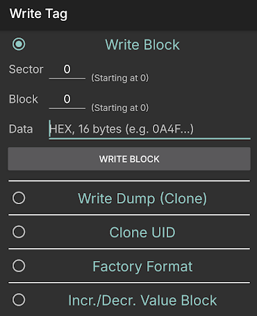 그 다음 다시 Write Tag 메뉴로 들어가서 Write Block을 선택한 뒤, 아래처럼 Sector와 Block에 0을 입력하고 Data에 방금 복사한 UID를 붙여넣기합니다. 그러고 나서 태그를 인식시키고 Write Block 버튼을 누르면 UID가 제대로 복사됩니다.