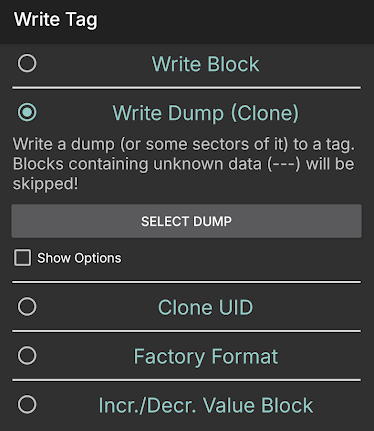 Mifare Classic Tool에서 Write Tag 메뉴로 들어간 후, Write Dump (Clone)을 선택하고 Select dump를 눌러 방금 덤프한 데이터를 선택합니다.