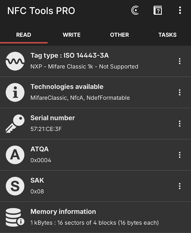 알리익스프레스 등지에서 Mifare Classic Tool(MCT)을 사용해 쓰기할 수 있는 NFC 태그를 구하면 됩니다.